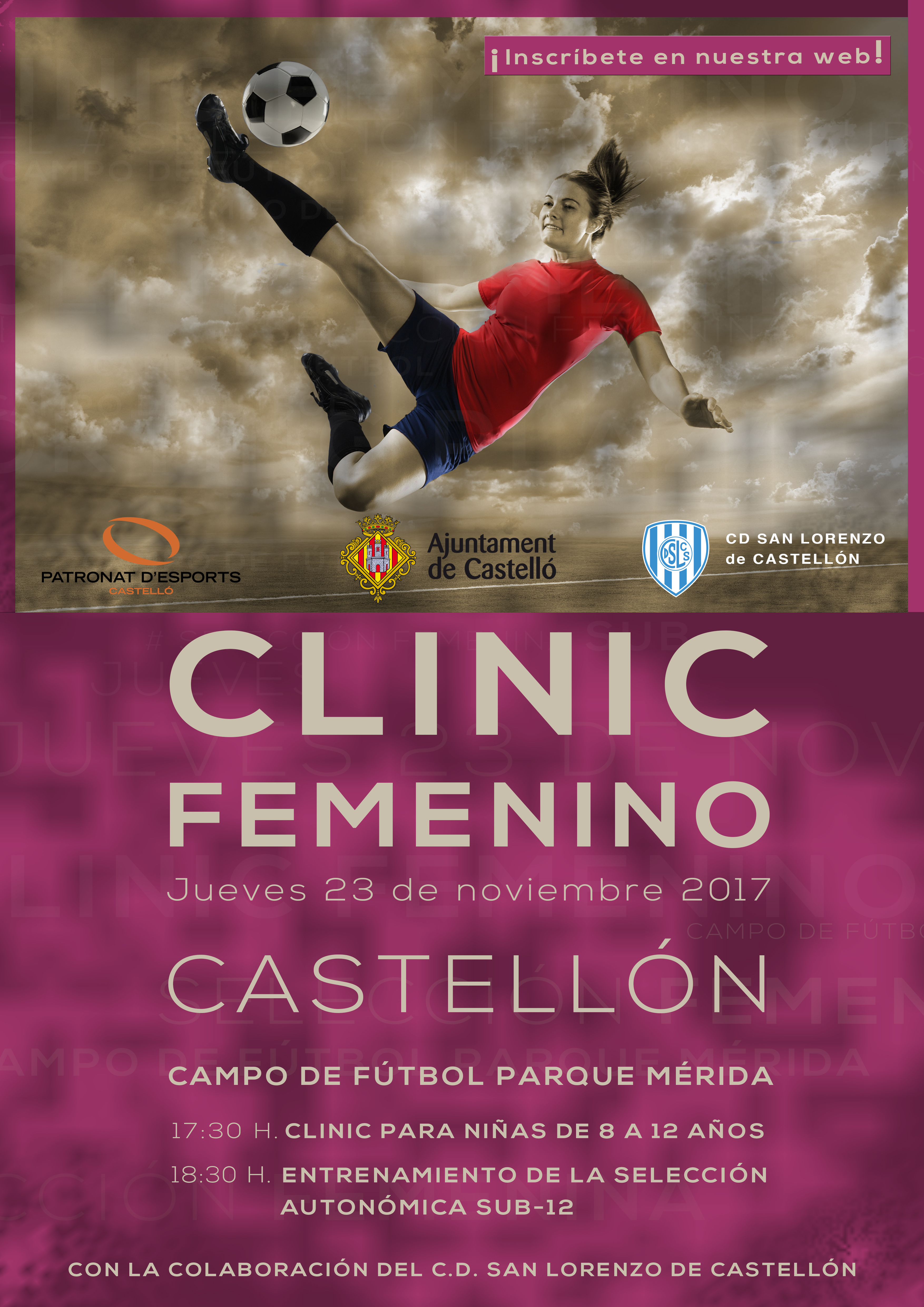El Campo de Fútbol ‘Parque Mérida’ de Castellón acogerá, el próximo día 23 de noviembre, un nuevo Clinic de Fútbol Base Femenino para niñas de 8 a 12 años con el cuerpo técnico de Selecciones de la Federación de Fútbol de la Comunidad Valenciana y con la colaboración del CD San Lorenzo de Castellón.